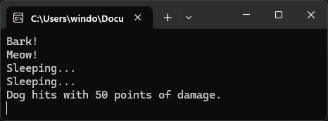 Console.WriteLine($"Dog hits with {damage} points of damage.");